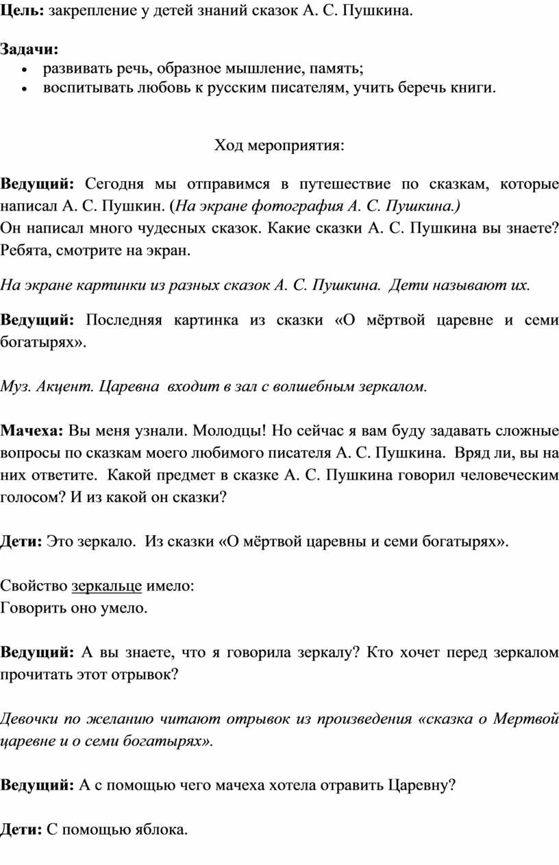 Цель: закрепление у детей знаний сказок А. С. Пушкина.