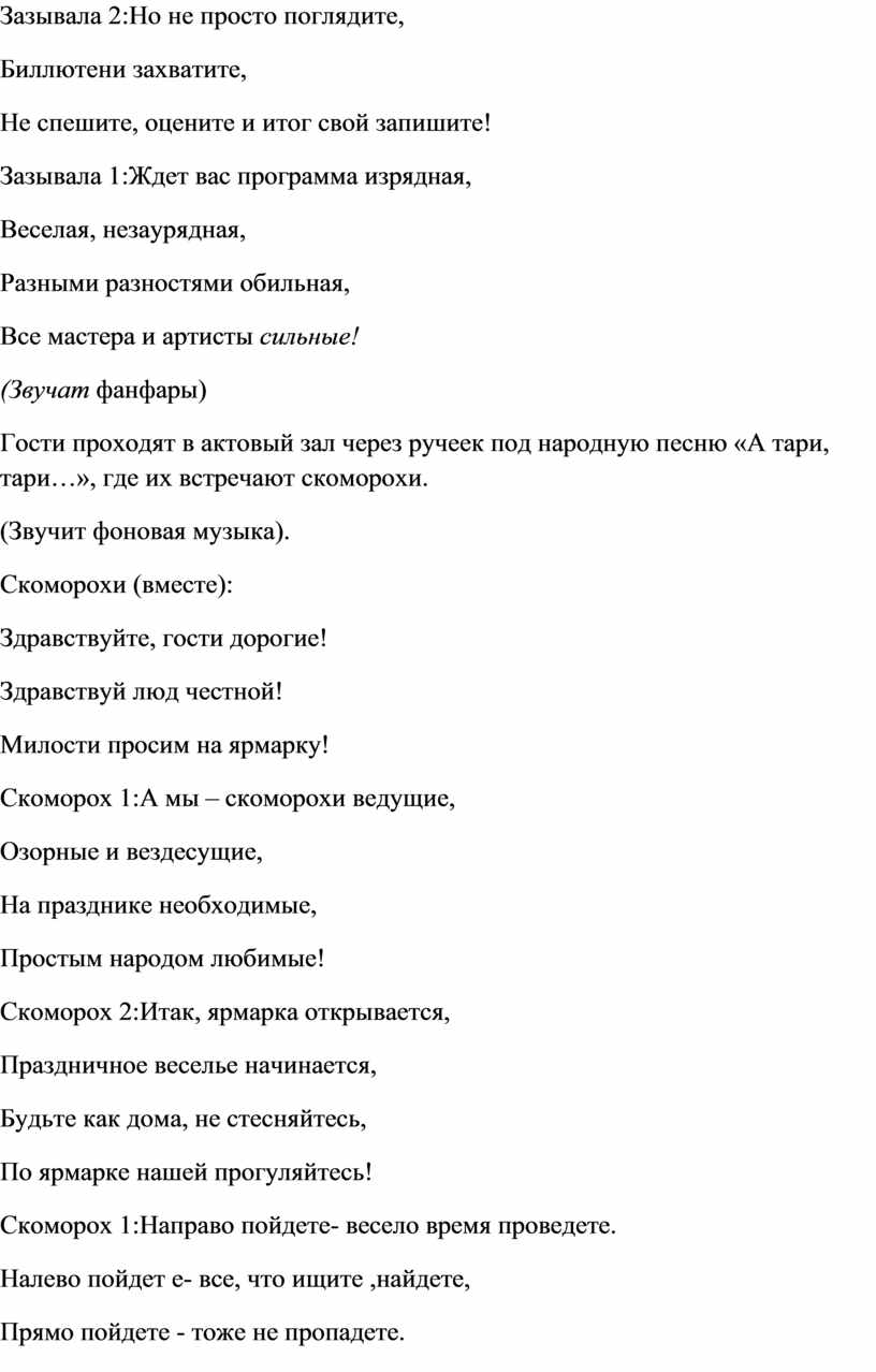 Гости проходят в актовый зал через ручеек под народную песню «А тари, тари…», где их встречают скоморохи.