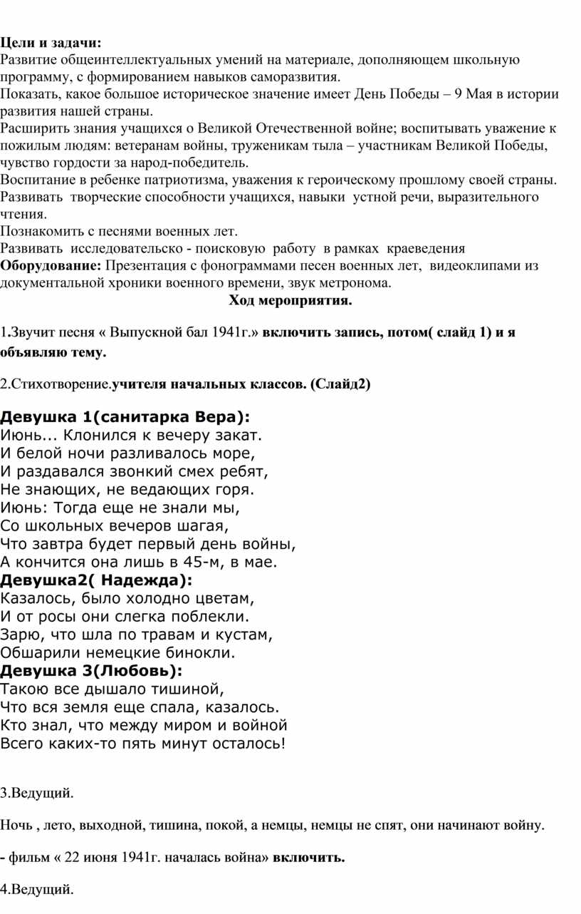 1.Звучит песня « Выпускной бал 1941г.» включить запись, потом( слайд 1) и я объявляю тему.