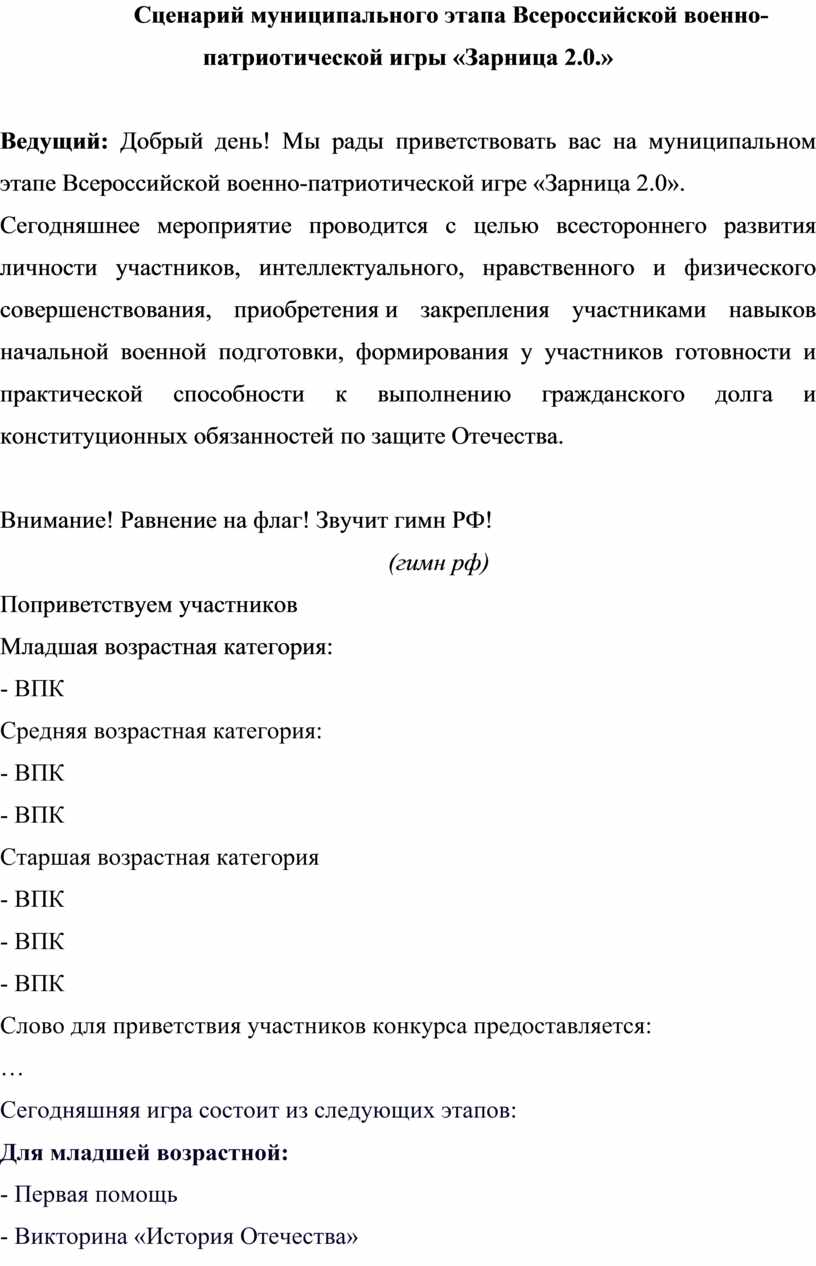 Сценарий муниципального этапа Всероссийской военно-патриотической игры «Зарница 2.0.»