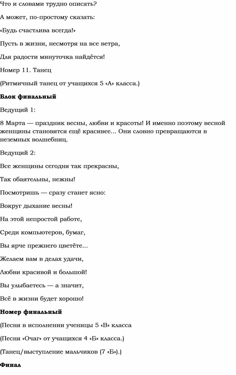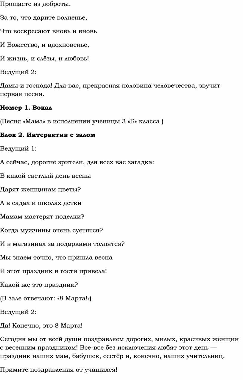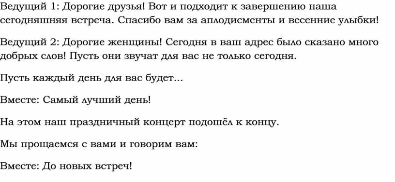 Ведущий 1: Дорогие друзья! Вот и подходит к завершению наша сегодняшняя встреча. Спасибо вам за аплодисменты и весенние улыбки!