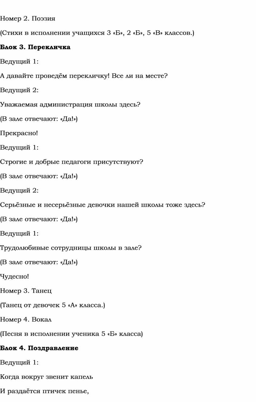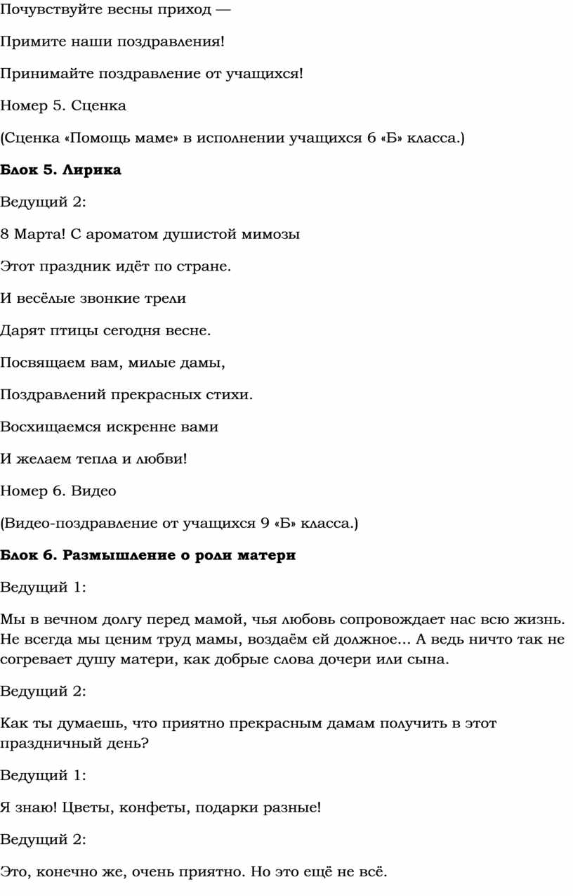 Сегодня мы от всей души поздравляем дорогих, милых, красивых женщин с весенним праздником! Все-все без исключения любят этот день — праздник наших мам, бабушек, сестёр и, конечно, наших учительниц.