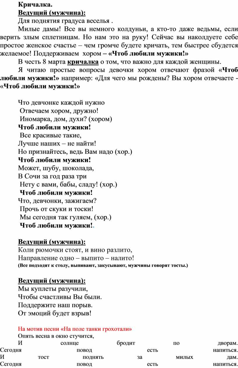 Я читаю простые вопросы девочки хором отвечают фразой «Чтоб любили мужики!» например: «Для чего мы рождены? Вы хором отвечаете -«Чтоб любили мужики!»