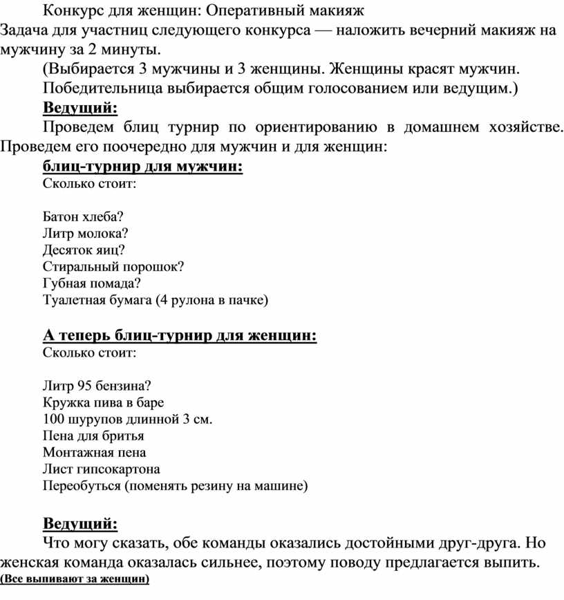 Проведем блиц турнир по ориентированию в домашнем хозяйстве. Проведем его поочередно для мужчин и для женщин: