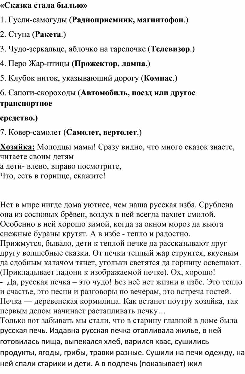 А следущее мое задание, для мам, звучит так. «Сказка стала былью». Я буду называть современные вещи , , а вы –волшебные предметы на русских сказок, соответствующие им.