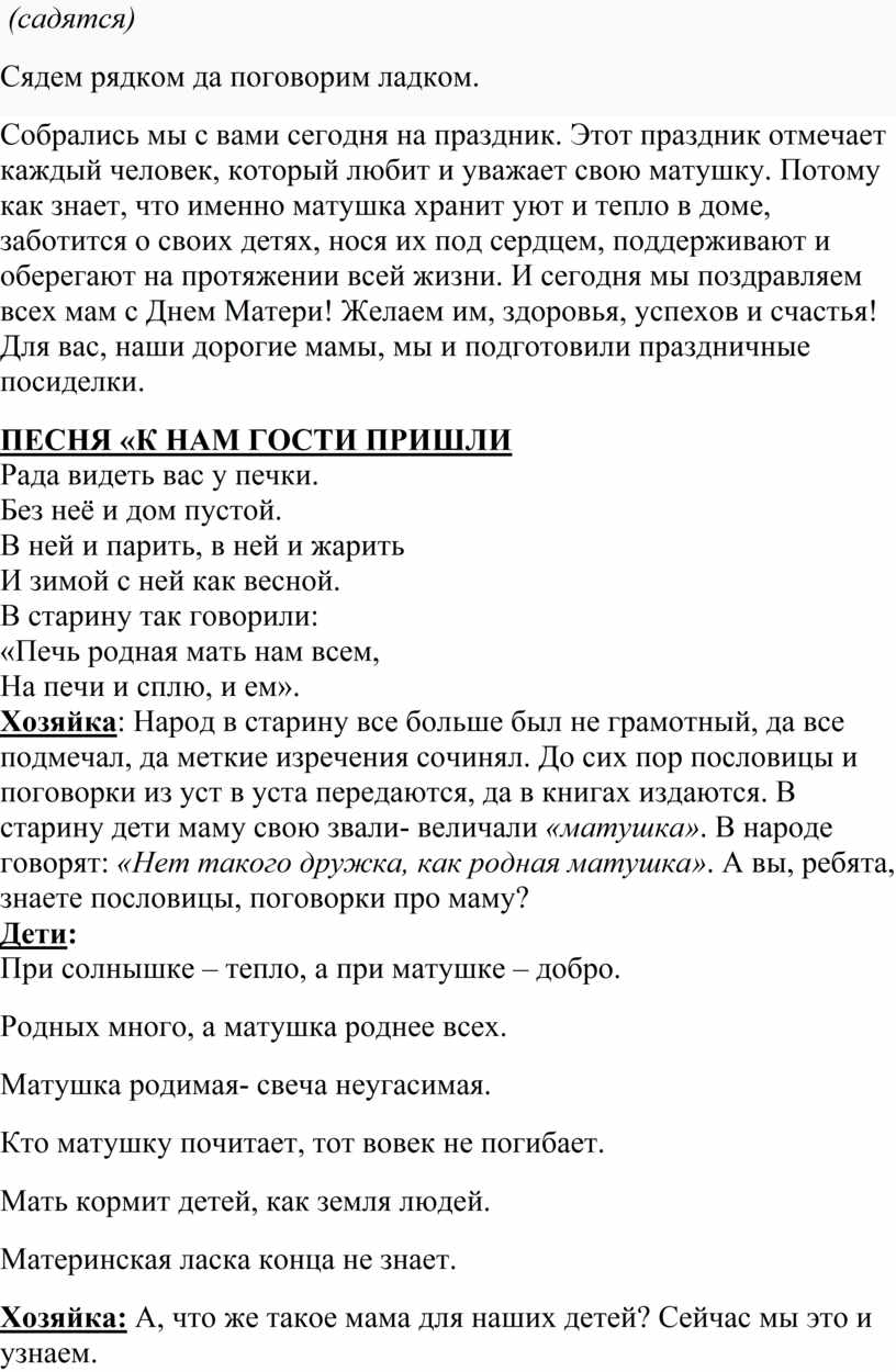 Хозяйка: Народ в старину все больше был не грамотный, да все подмечал, да меткие изречения сочинял. До сих пор пословицы и поговорки из уст в уста передаются, да в книгах издаются. В старину дети маму свою звали- величали «матушка». В народе говорят: «Нет такого дружка, как родная матушка». А вы, ребята, знаете пословицы, поговорки про маму?