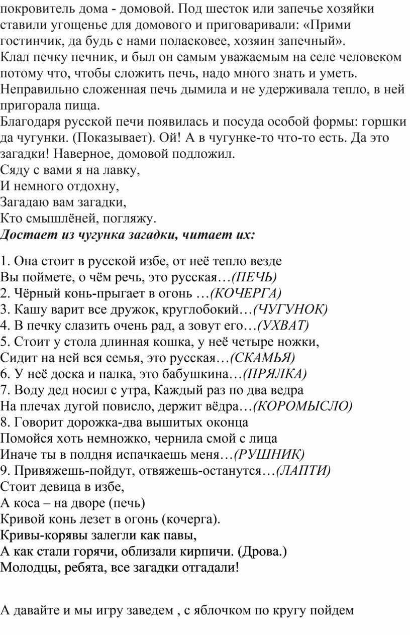 Благодаря русской печи появилась и посуда особой формы: горшки да чугунки. (Показывает). Ой! А в чугунке-то что-то есть. Да это загадки! Наверное, домовой подложил.