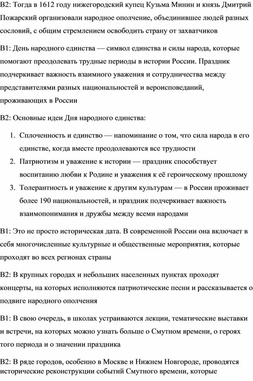 В1: День народного единства — символ единства и силы народа, которые помогают преодолевать трудные периоды в истории России. Праздник подчеркивает важность взаимного уважения и сотрудничества между представителями разных национальностей и вероисповеданий, проживающих в России