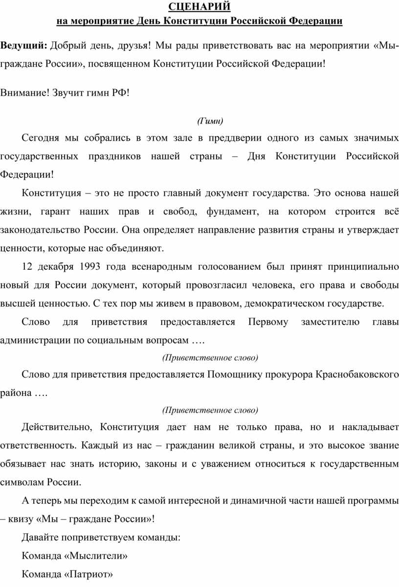 Ведущий: Добрый день, друзья! Мы рады приветствовать вас на мероприятии «Мы-граждане России», посвященном Конституции Российской Федерации!