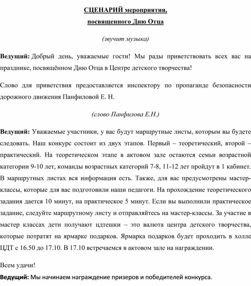 Ведущий: Добрый день, уважаемые гости! Мы рады приветствовать всех вас на празднике, посвящённом Дню Отца в Центре детского творчества!