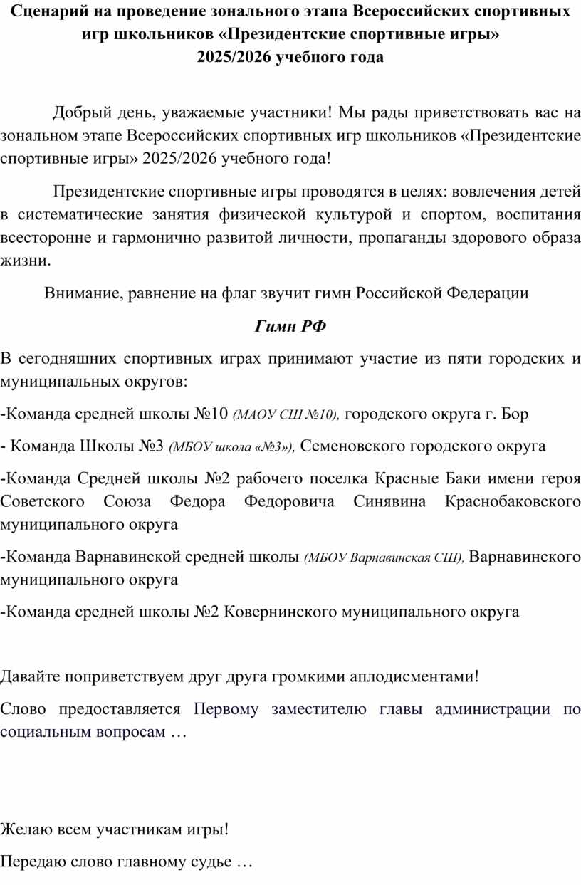 Сценарий на проведение зонального этапа Всероссийских спортивных игр школьников «Президентские спортивные игры»