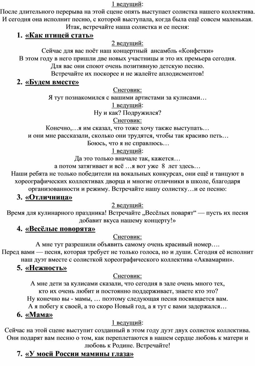 Сегодня вы услышите много новых песен не только про Новый год, но и про любовь, про Победу, про Родину, дружбу и счастье. А также увидите, как ваши дети уже не только стоят на этой сцене, но ещё поют, и даже красиво двигаются.