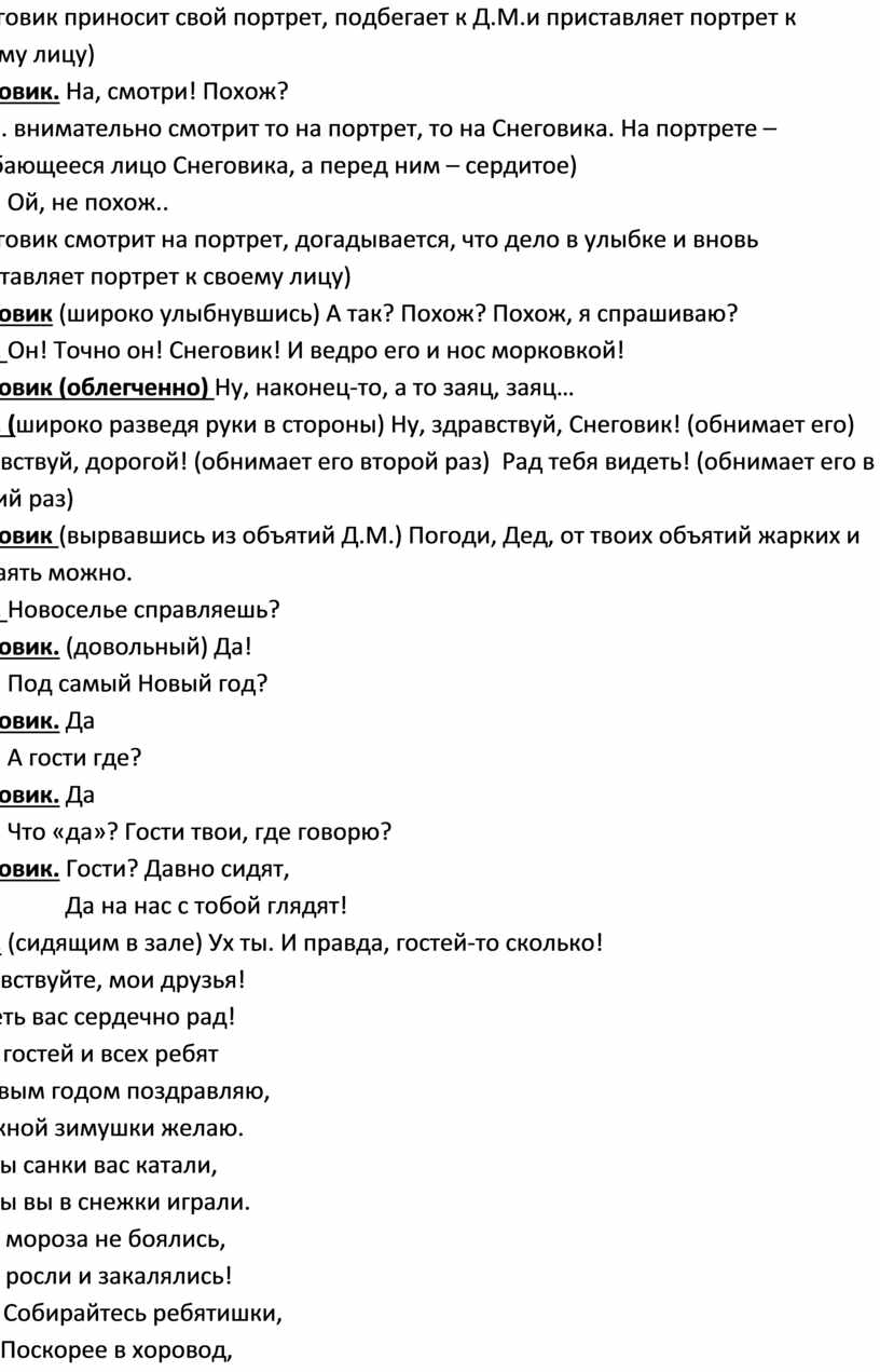 Д.М. (широко разведя руки в стороны) Ну, здравствуй, Снеговик! (обнимает его) Здравствуй, дорогой! (обнимает его второй раз) Рад тебя видеть! (обнимает его в третий раз)