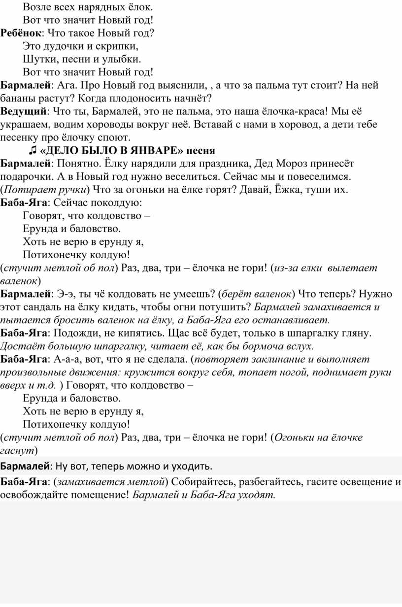 (не видит детей, обращается к родителям) Ну и чаво орём? Чаво кричим? (к ёлке) Это ещё что тут торчит? (Хватает ёлку за ветку). Ой-ей-ей! Злючая, вреднючая, как я! (Обращает внимание на детей) О! А вы тут чего делаете? Я же вас не приглашала?
