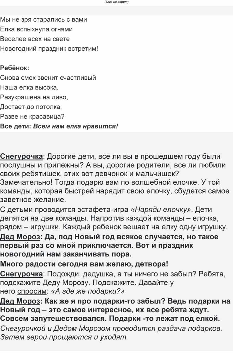 Снегурочка: Подожди, дедушка, а ты ничего не забыл? Ребята, подскажите Деду Морозу. Подскажите. Давайте у него спросим: «А где же подарки?»