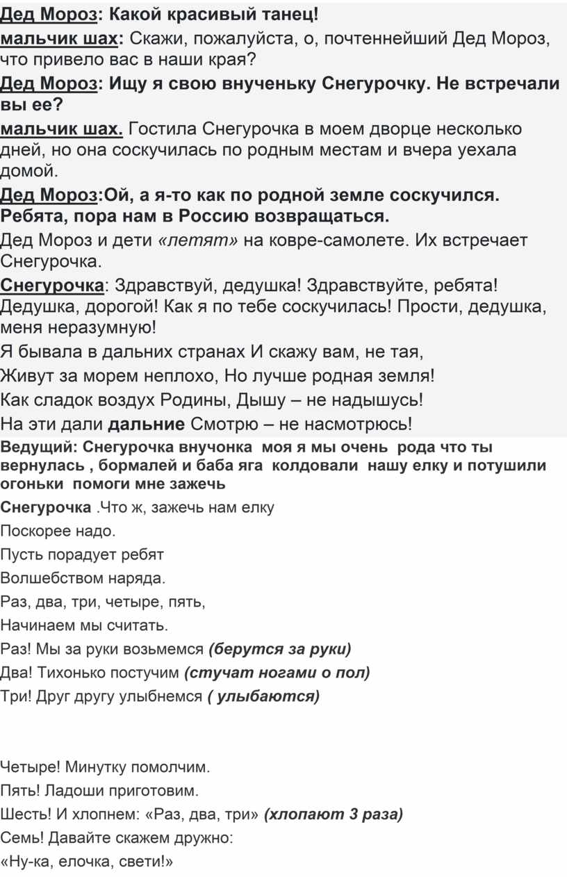 Снегурочка: Здравствуй, дедушка! Здравствуйте, ребята! Дедушка, дорогой! Как я по тебе соскучилась! Прости, дедушка, меня неразумную!