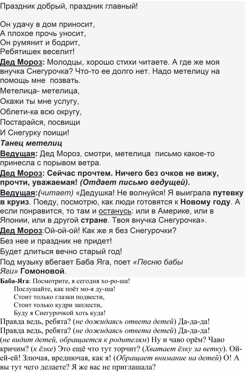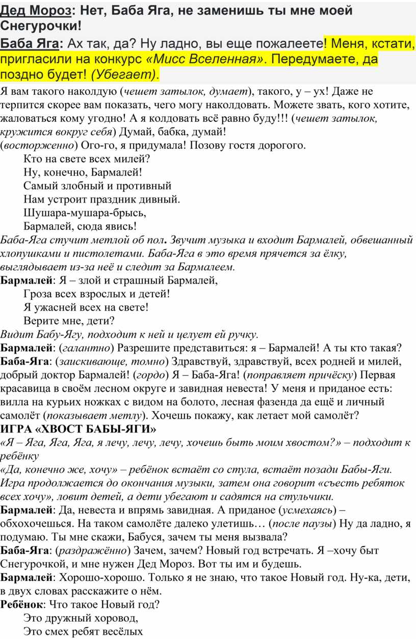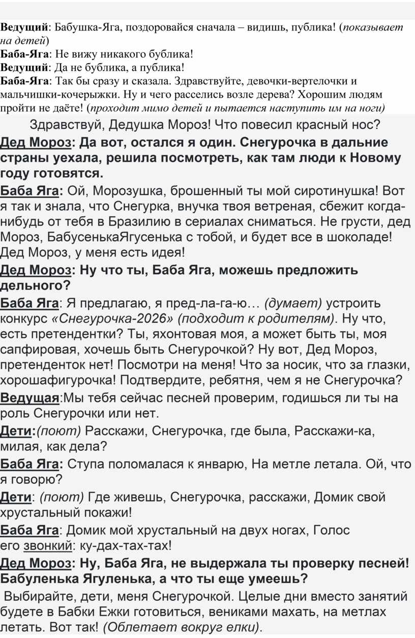 Баба Яга: Я предлагаю, я пред-ла-га-ю… (думает) устроить конкурс «Снегурочка-2026» (подходит к родителям). Ну что, есть претендентки? Ты, яхонтовая моя, а может быть ты, моя сапфировая, хочешь быть Снегурочкой? Ну вот, Дед Мороз, претенденток нет! Посмотри на меня! Что за носик, что за глазки, хорошафигурочка! Подтвердите, ребятня, чем я не Снегурочка?