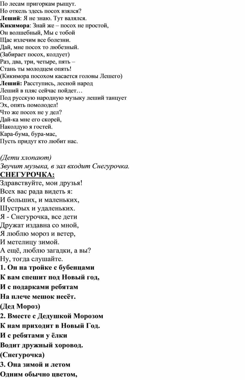 Дед Мороз: Ну-ка, ёлка, встрепенись (ударяет посохом)! /все: "встрепенись!"