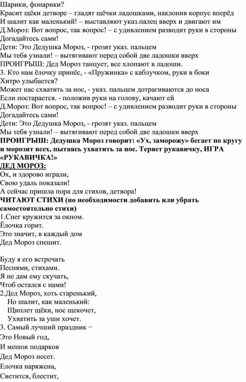 ПРОИГРЫШ: Дедушка Мороз говорит: «Ух, заморожу» бегает по кругу и морозит всех, пытаясь ухватить за нос. Теряет рукавичку, ИГРА «РУКАВИЧКА!»