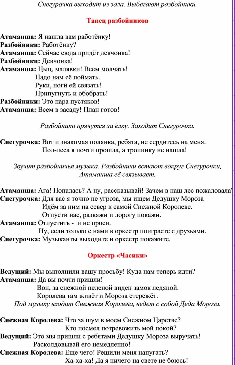 Взрослые: Ведущий, Дед Мороз, Снегурочка, Снежная королева, Атаманша