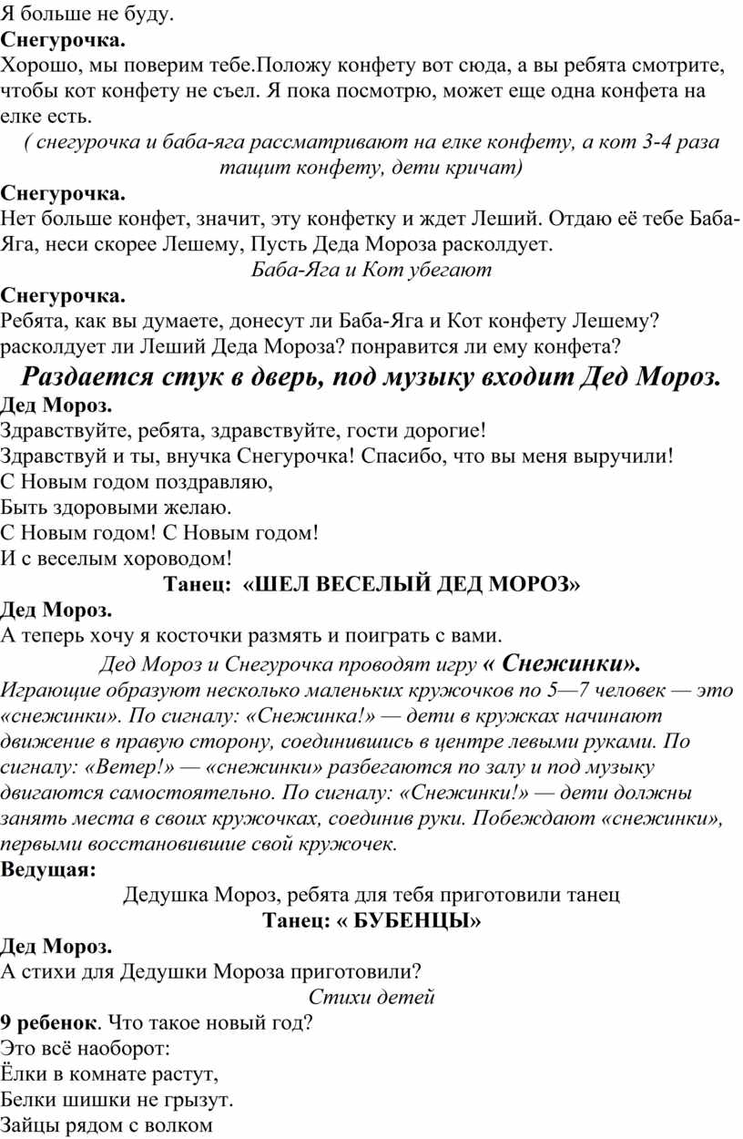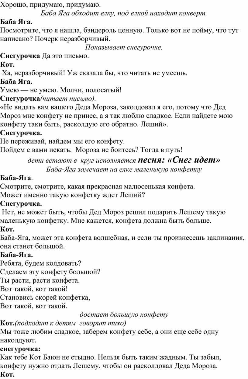 Слышен шум мотора, в зал на метле влетает Баба Яга со своим приятелем Котом Баюном. У Бабы Яги за плечами маленький рюкзак (мешок), под мышкой она держит игрушечного Деда Мороза.
