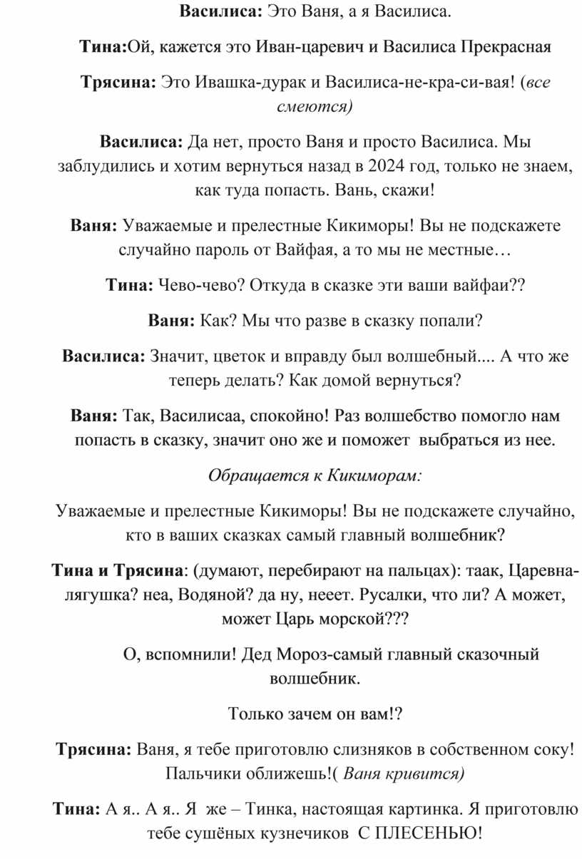 Ваня: Ой, да ладно, это всё фейк, ваши сказочки… Сплошные выдумки. Вот подумай, сколько мы географических карт изучали и ни на одной из них нет сказочной страны, этого твоего Лукоморья. А все эти сапоги-скороходы, шапки-невидимки это все выдумки чистой воды для таких наивных девчонок, как ты.