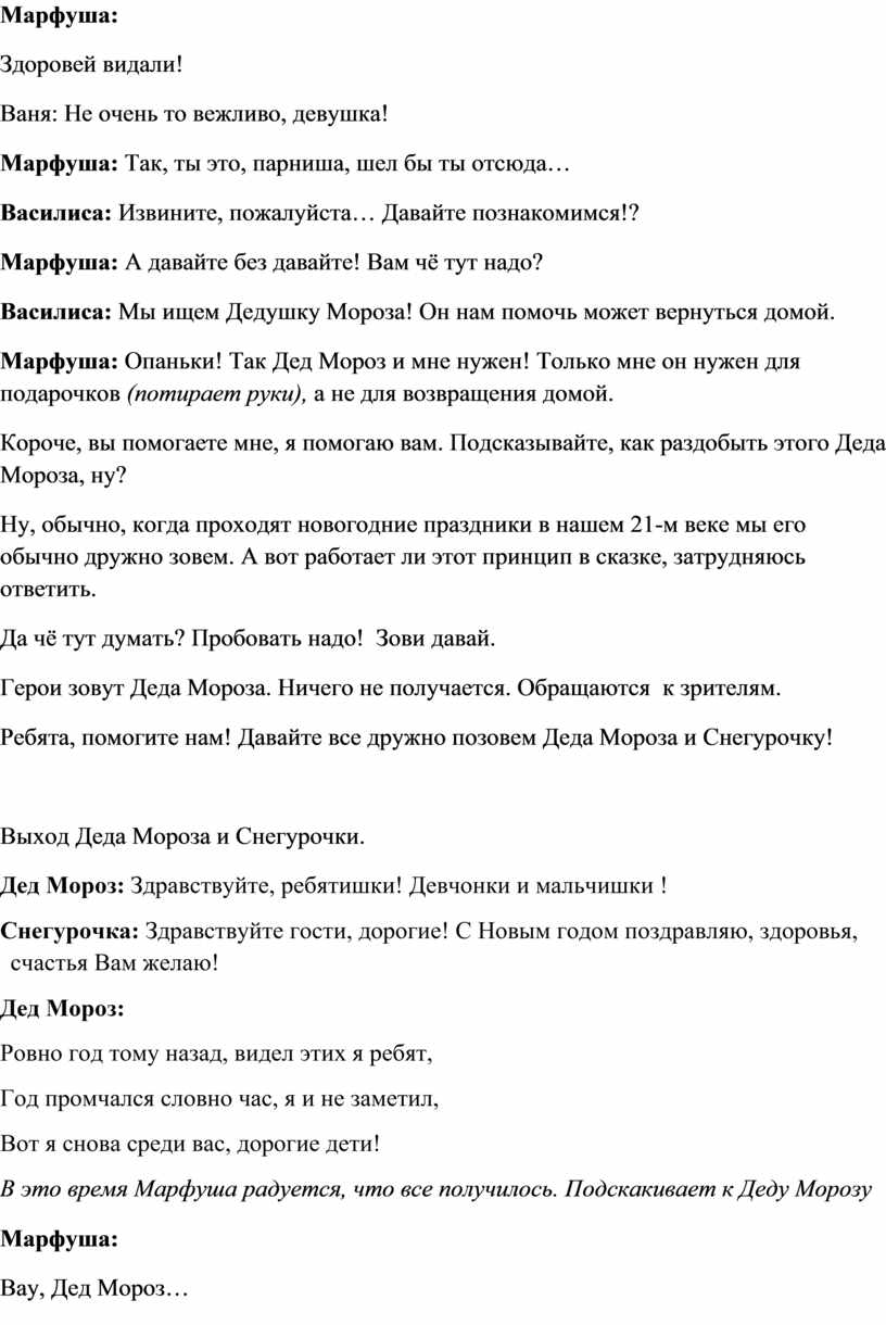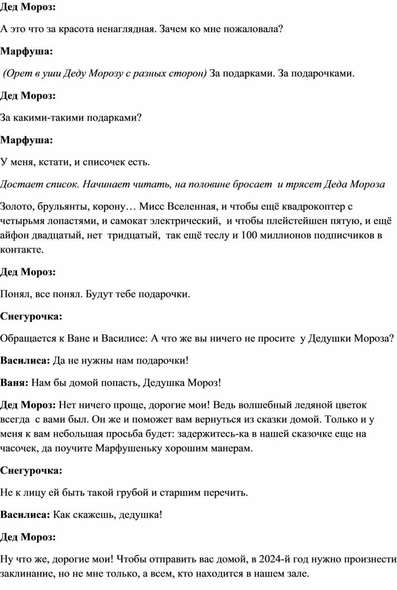 Дед Мороз: Нет ничего проще, дорогие мои! Ведь волшебный ледяной цветок всегда с вами был. Он же и поможет вам вернуться из сказки домой. Только и у меня к вам небольшая просьба будет: задержитесь-ка в нашей сказочке еще на часочек, да поучите Марфушеньку хорошим манерам.
