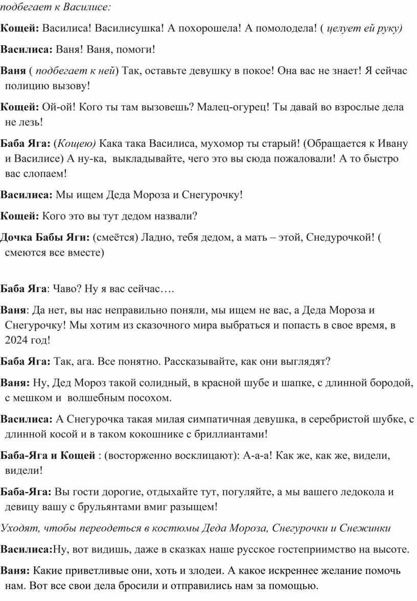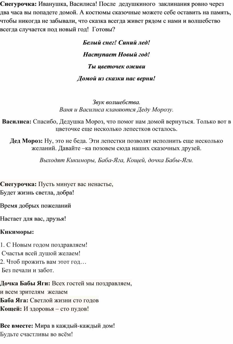 Снегурочка: Иванушка, Василиса! После дедушкиного заклинания ровно через два часа вы попадете домой. А костюмы сказочные можете себе оставить на память, чтобы никогда не забывали, что сказка всегда живет рядом с нами и волшебство всегда случается под новый год! Готовы?