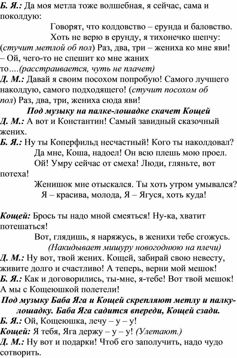 Кощей: Я тебя, Яга держу – у – у! (Улетают.)