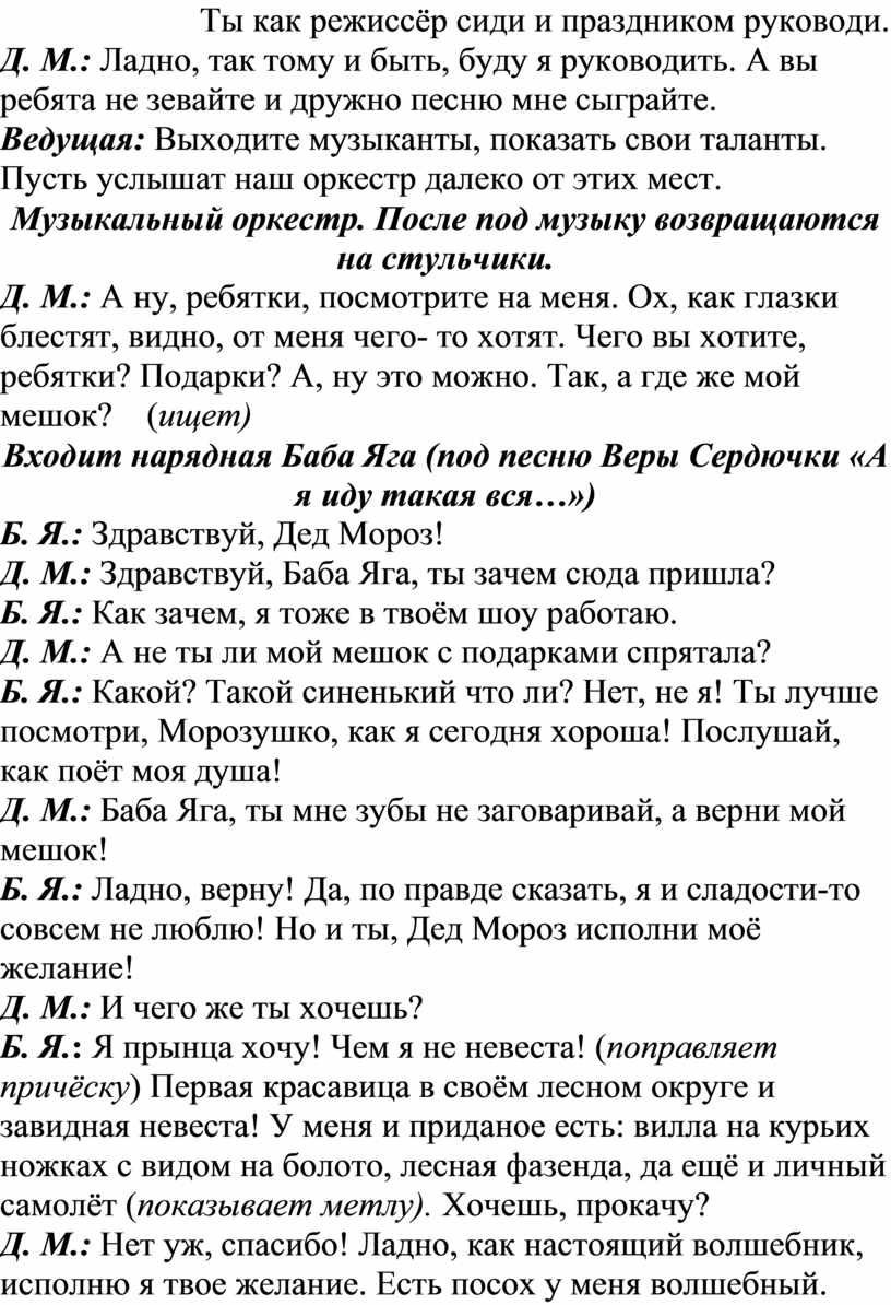 Д. М.: Ладно, так тому и быть, буду я руководить. А вы ребята не зевайте и дружно песню мне сыграйте.