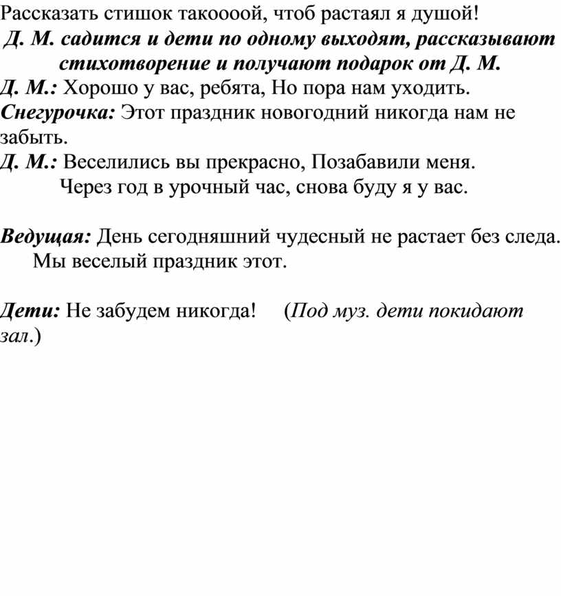 Д. М. садится и дети по одному выходят, рассказывают стихотворение и получают подарок от Д. М.
