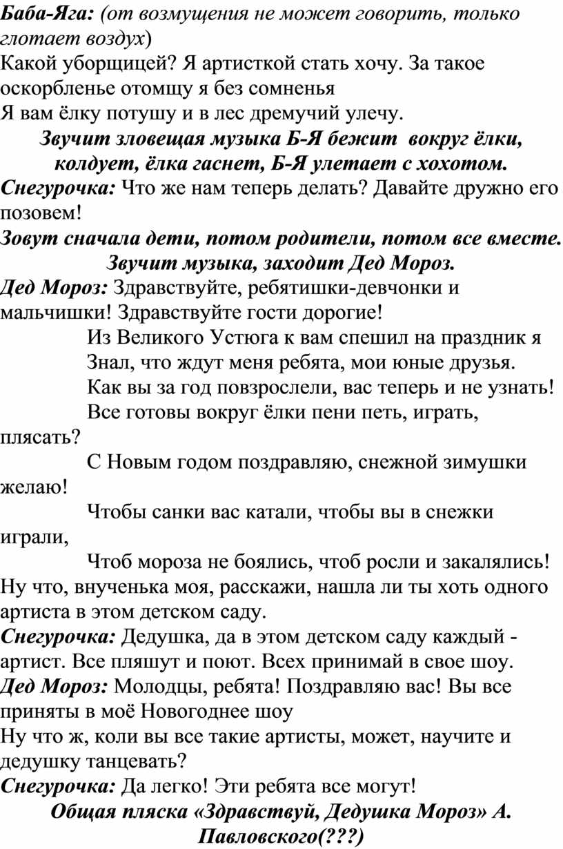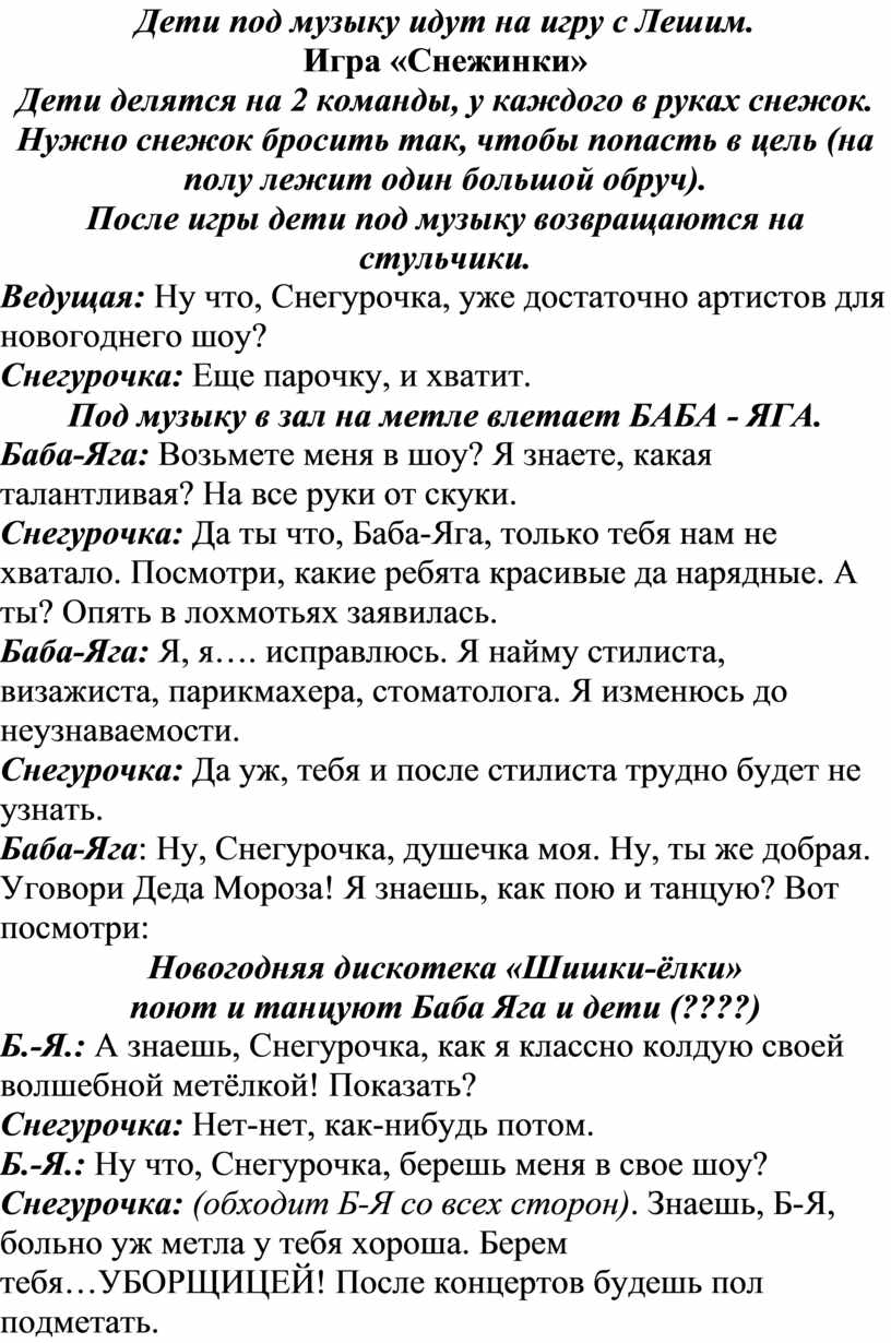 Снегурочка: Да ты что, Баба-Яга, только тебя нам не хватало. Посмотри, какие ребята красивые да нарядные. А ты? Опять в лохмотьях заявилась.