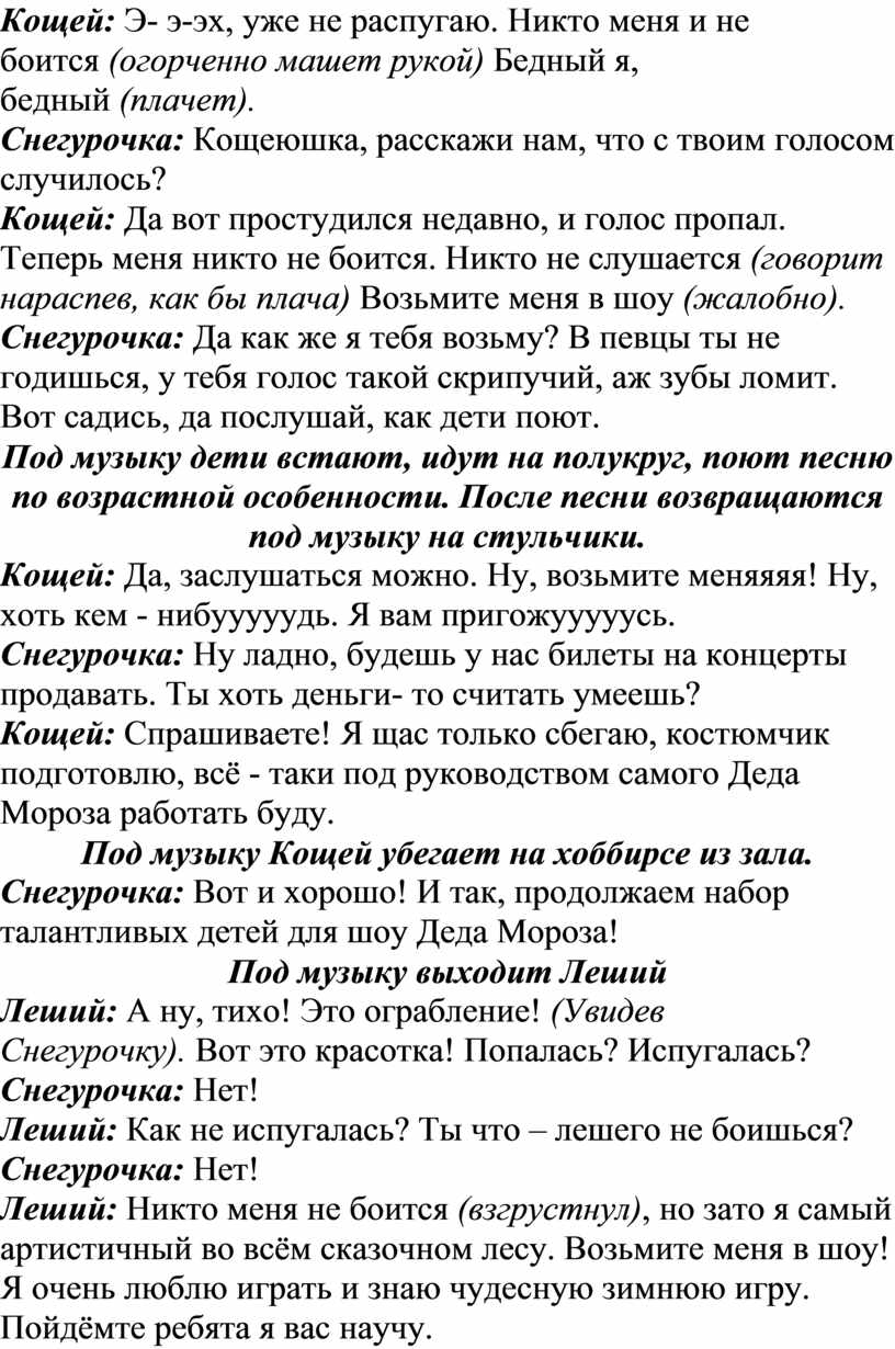 Кощей: Да вот простудился недавно, и голос пропал. Теперь меня никто не боится. Никто не слушается (говорит нараспев, как бы плача) Возьмите меня в шоу (жалобно).