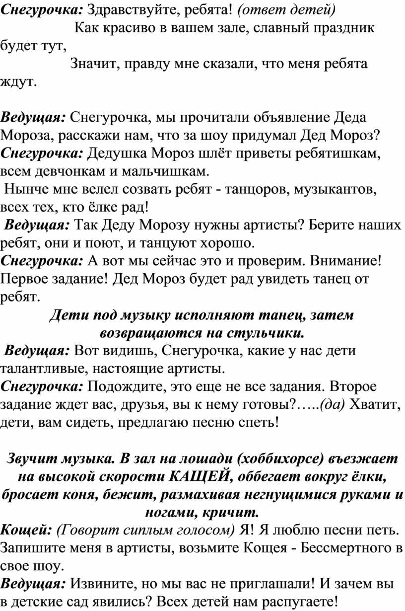 Снегурочка: Дедушка, да в этом детском саду каждый - артист. Все пляшут и поют. Всех принимай в свое шоу.