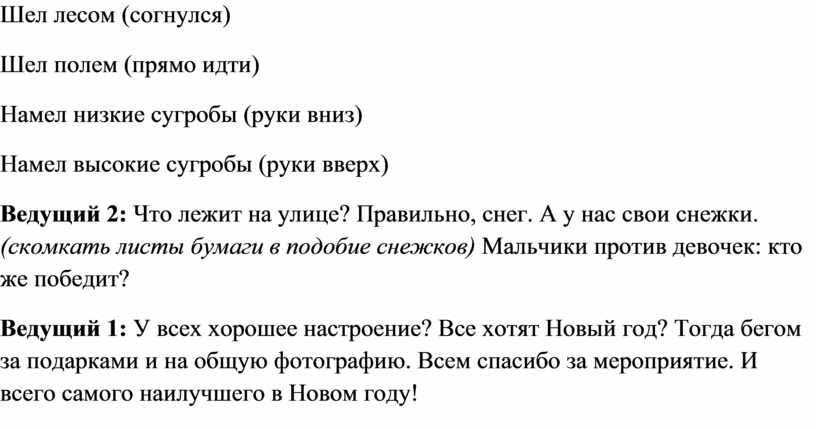 Ведущий 1: И первый конкурс у нас на сегодня – это «Зимний крокодил». Мы заранее подготовили несколько вариантов, но может у кого-то будут свои идеи. (Написать на небольших листочках следующие слова: 1. в лесу родилась елочка; 2. дед мороз несет подарки; 3. наряжают елочку; 4. бьют часы двенадцать; 5. снежинки кружатся на ветру; 6. девочка катается на коньках)