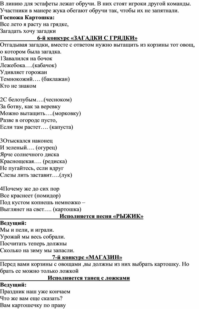 Надо добежать до картошки, лопатой взять одну картофелину, бегом возвратиться к команде и картофелину положить в ведро, а лопату отдать следующему игроку. Жюри присуждает очки, отмечает лучших игроков