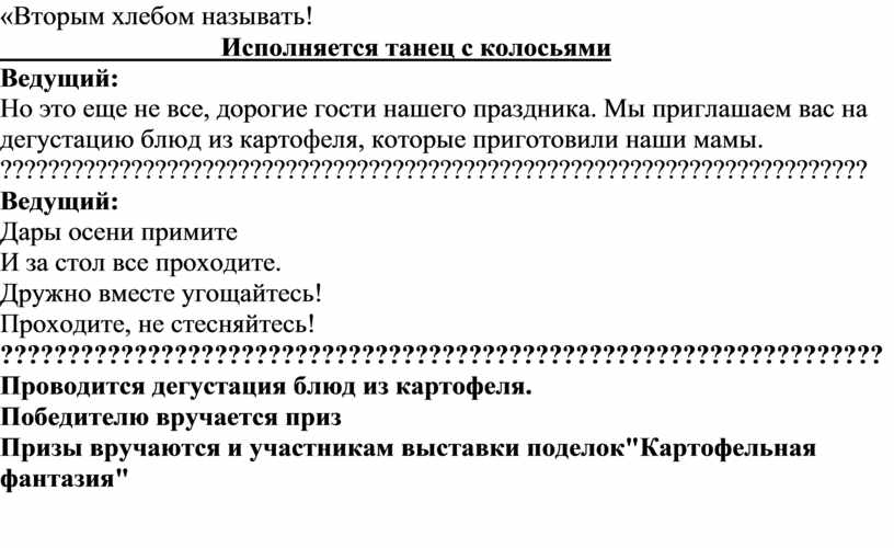Но это еще не все, дорогие гости нашего праздника. Мы приглашаем вас на дегустацию блюд из картофеля, которые приготовили наши мамы.