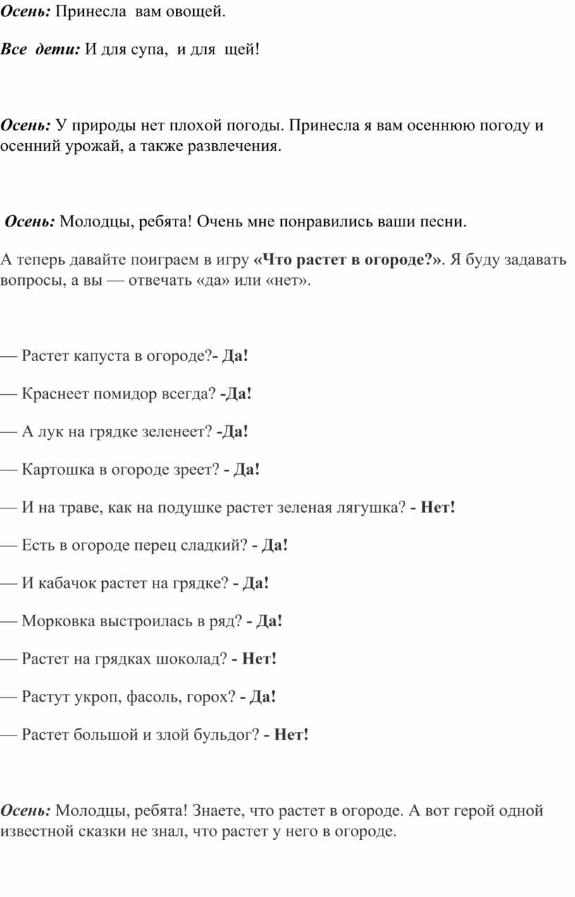 А теперь давайте поиграем в игру «Что растет в огороде?». Я буду задавать вопросы, а вы — отвечать «да» или «нет».