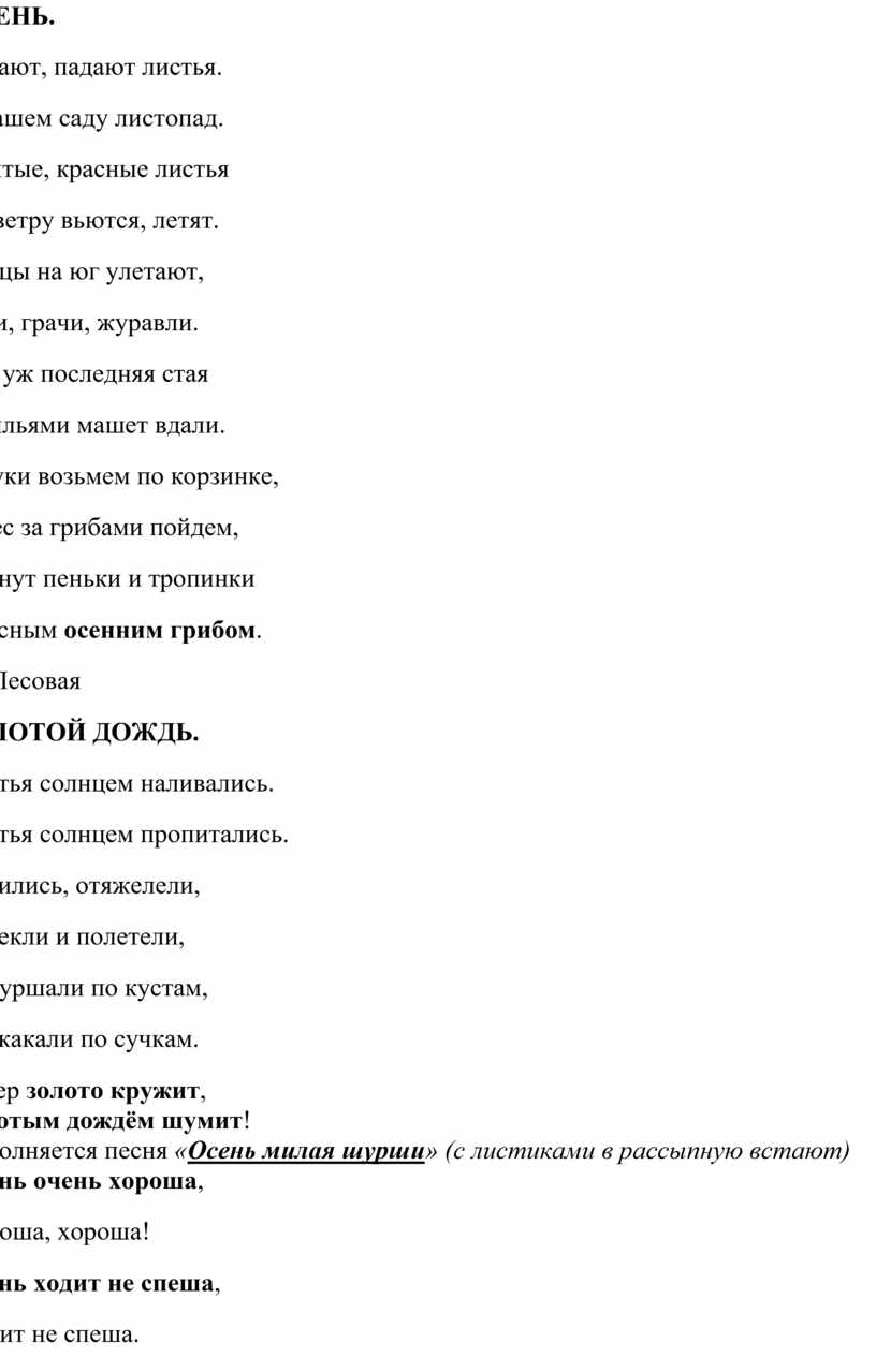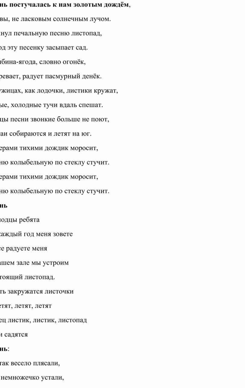- Закреплять и расширять у детей представления об осенних явлениях природы посредством выразительного исполнения ими песен, танцев, стихотворений, игр;