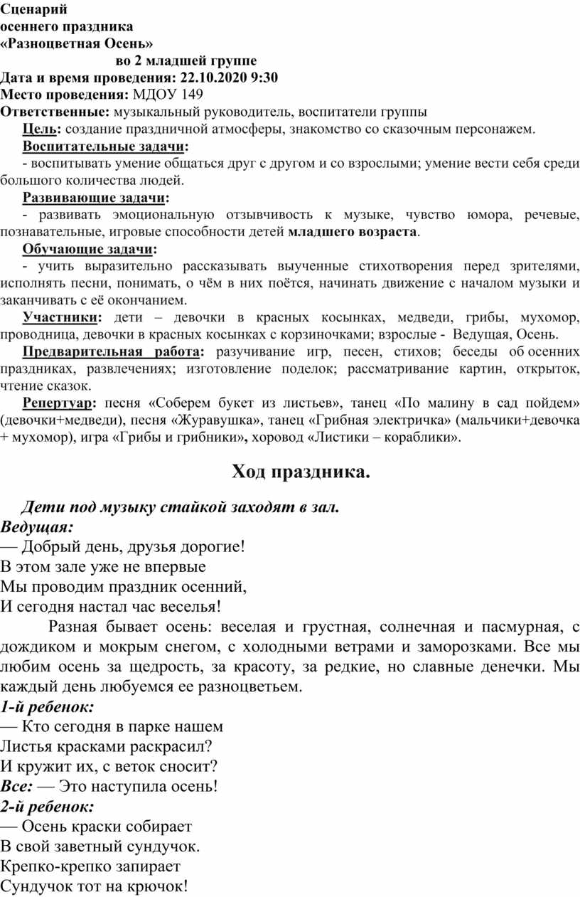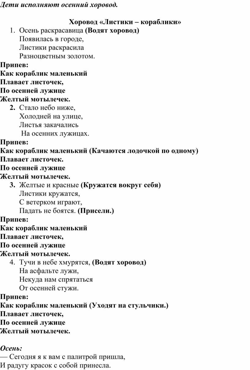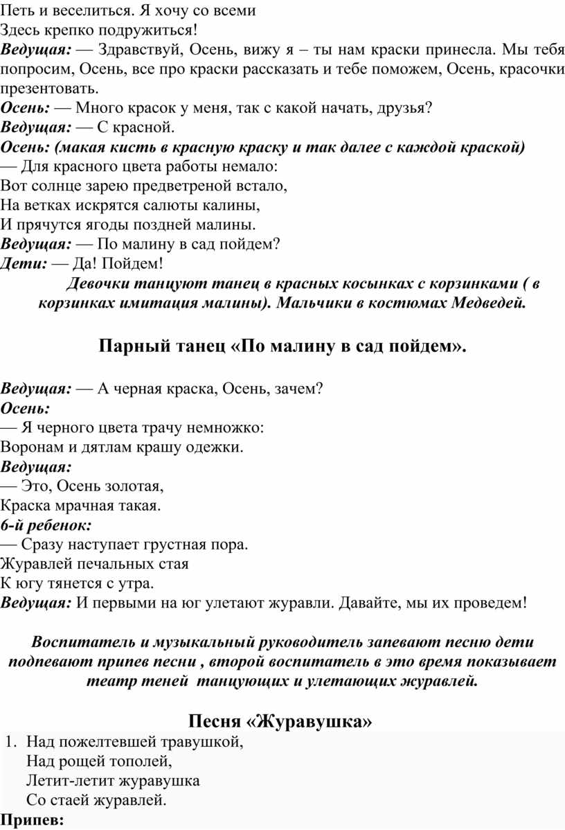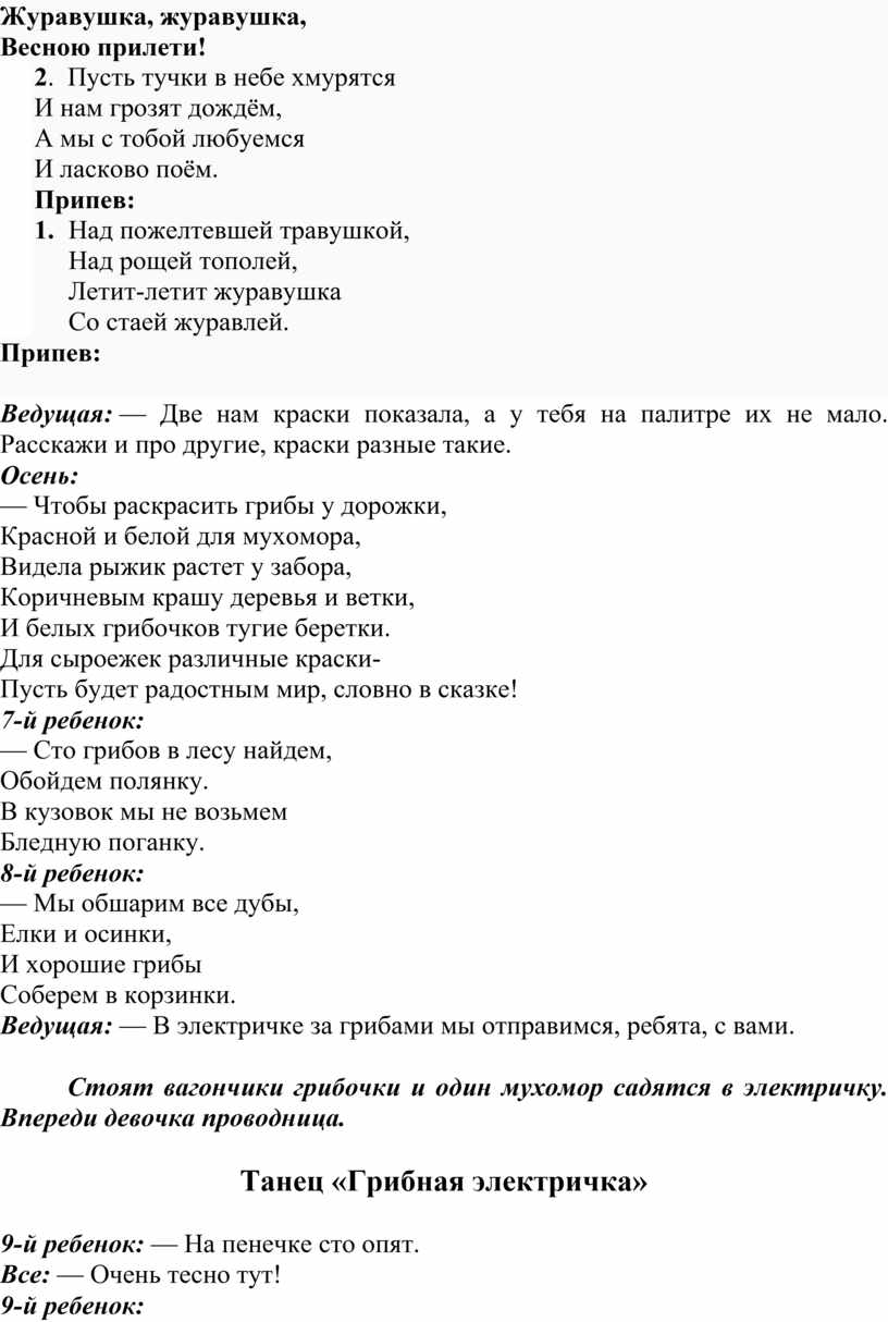 Репертуар: песня «Соберем букет из листьев», танец «По малину в сад пойдем» (девочки+медведи), песня «Журавушка», танец «Грибная электричка» (мальчики+девочка + мухомор), игра «Грибы и грибники», хоровод «Листики – кораблики».