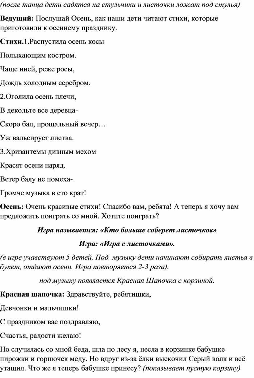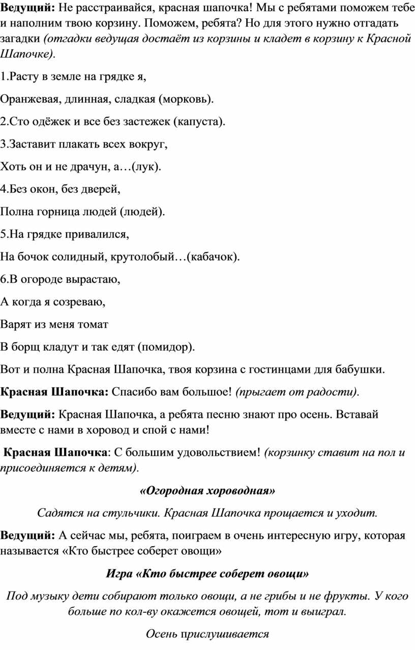 Ведущий: Красная Шапочка, а ребята песню знают про осень. Вставай вместе с нами в хоровод и спой с нами!