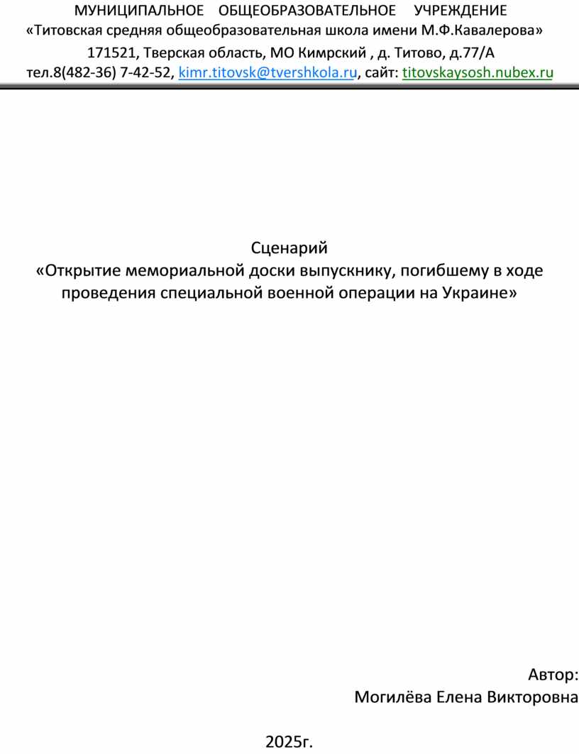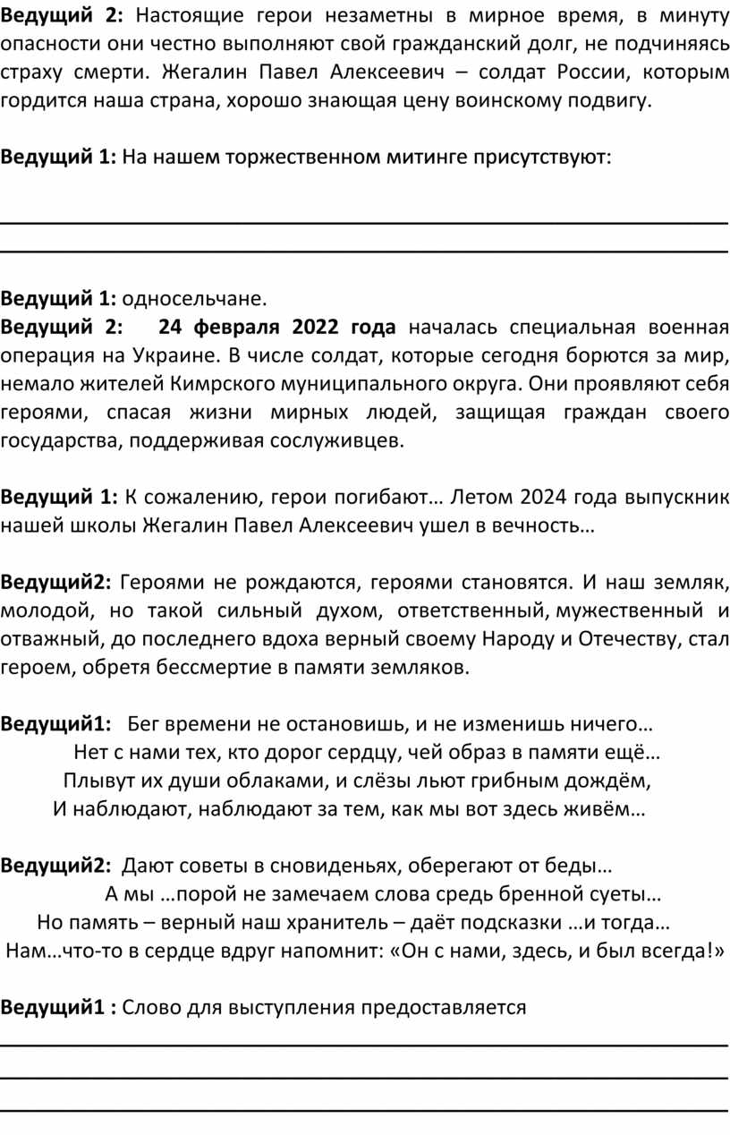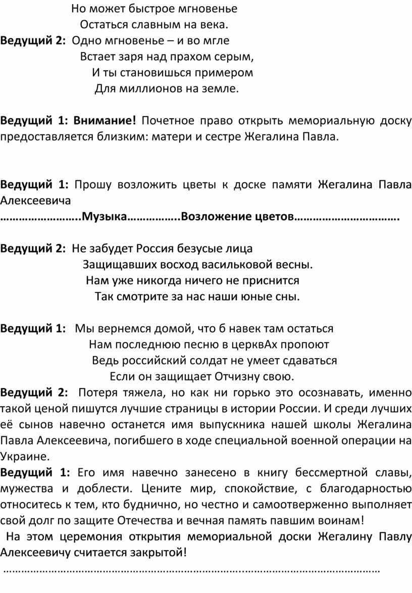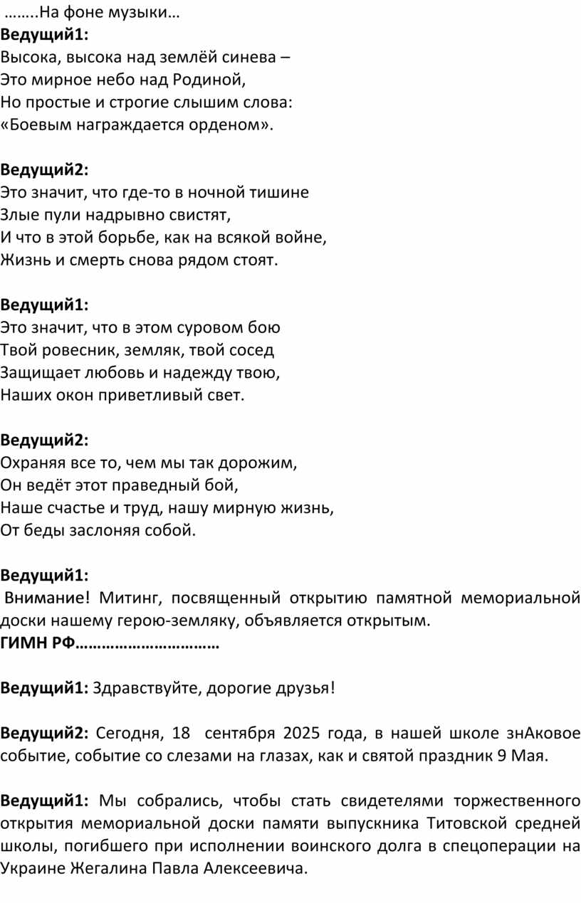 Ведущий1: Мы собрались, чтобы стать свидетелями торжественного открытия мемориальной доски памяти выпускника Титовской средней школы, погибшего при исполнении воинского долга в спецоперации на Украине Жегалина Павла Алексеевича.