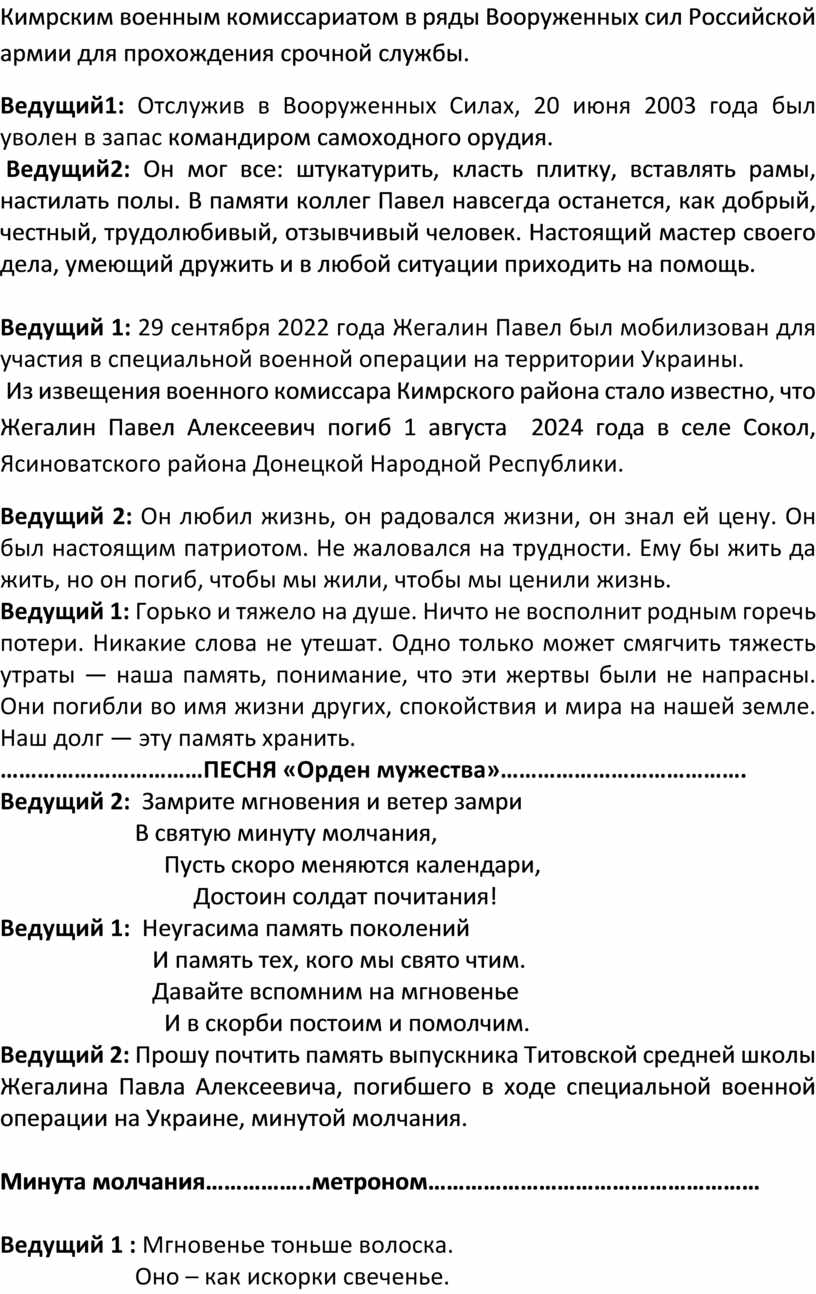 Ведущий 2: Прошу почтить память выпускника Титовской средней школы Жегалина Павла Алексеевича, погибшего в ходе специальной военной операции на Украине, минутой молчания.