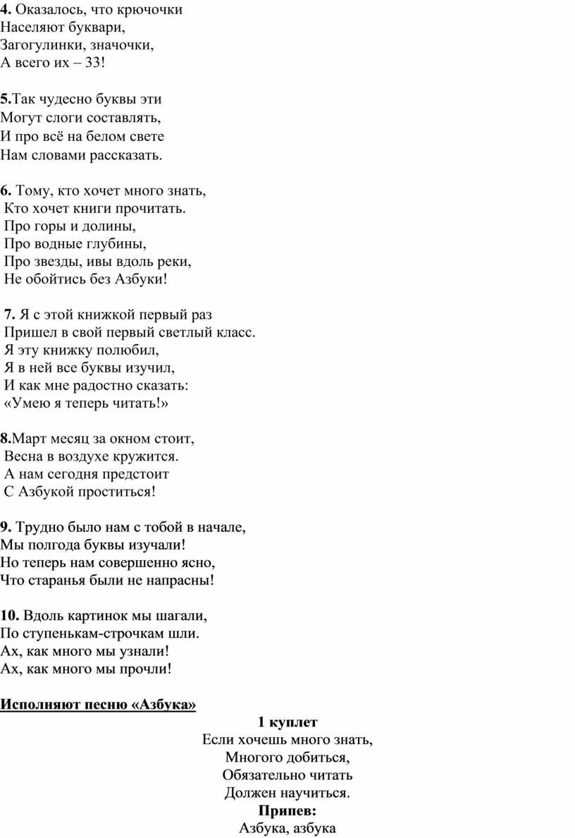 И поэтому, сегодня у нас праздник, посвященный прощанию с вашей первой книгой - «Азбукой». Вы познакомились со всеми буквами русского алфавита, умеете произносить звуки, знаете все секреты. Настала пора совершить увлекательное путешествие в страну 33 букв, которые могут составить сотни тысяч слов. Поделитесь с нами, чему вы научились за это время в школе.