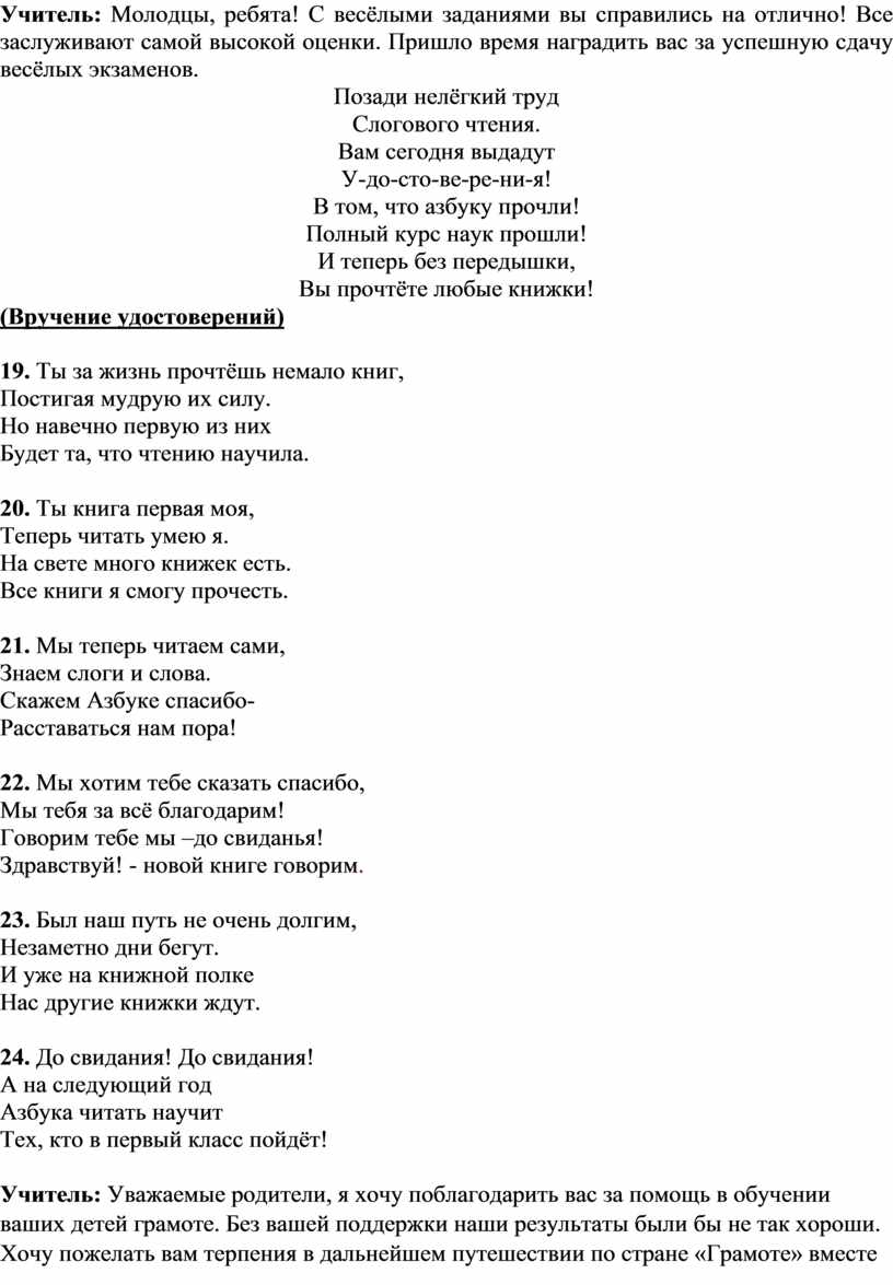 Учитель: Уважаемые родители, я хочу поблагодарить вас за помощь в обучении ваших детей грамоте. Без вашей поддержки наши результаты были бы не так хороши. Хочу пожелать вам терпения в дальнейшем путешествии по стране «Грамоте» вместе с детьми. Не бросайте их в этом океане одних, ведь вместе всегда легче справляться с трудностями.