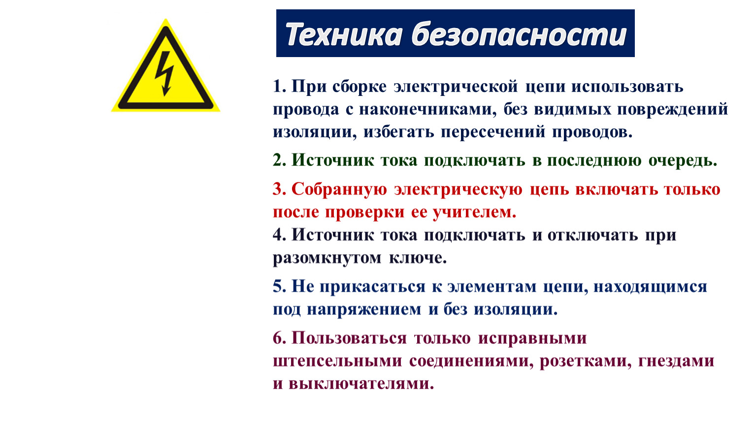 3. Собранную электрическую цепь включать только после проверки ее учителем.