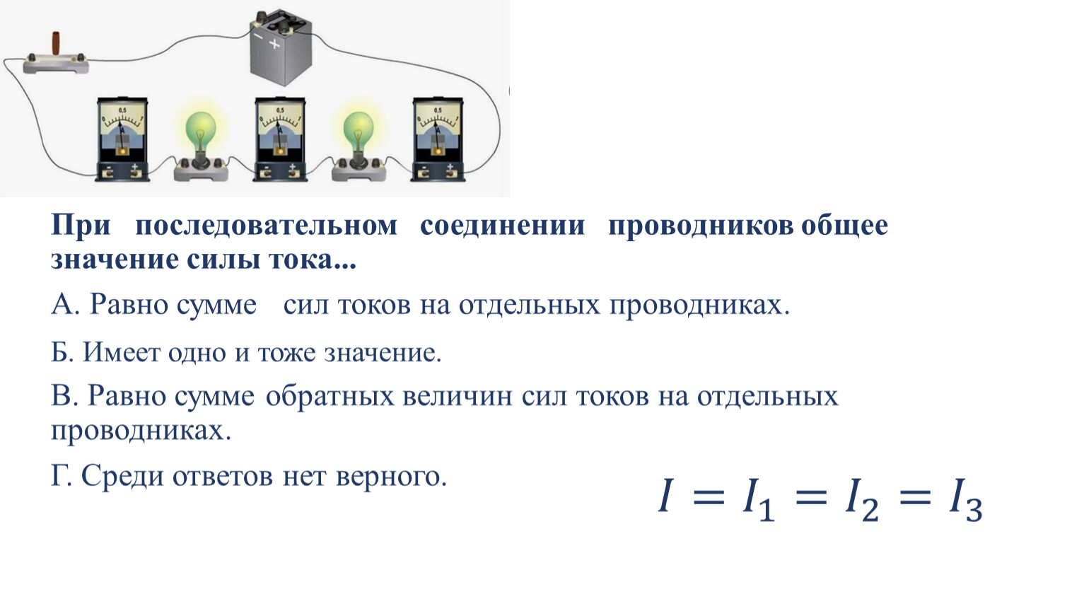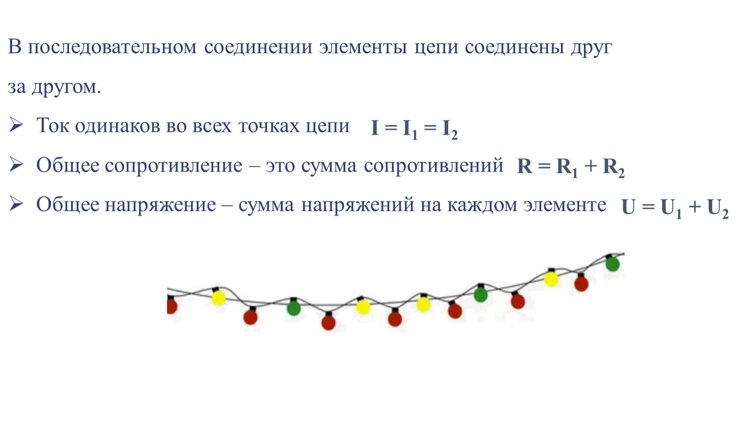 Последовательное соединение – соединение, при котором конец первого проводника соединяют с началом второго, конец второго – с началом третьего и т.д.