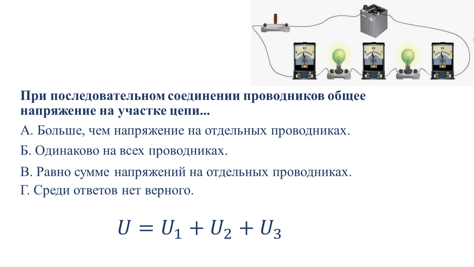 При последовательном соединении проводников общее напряжение на участке цепи...