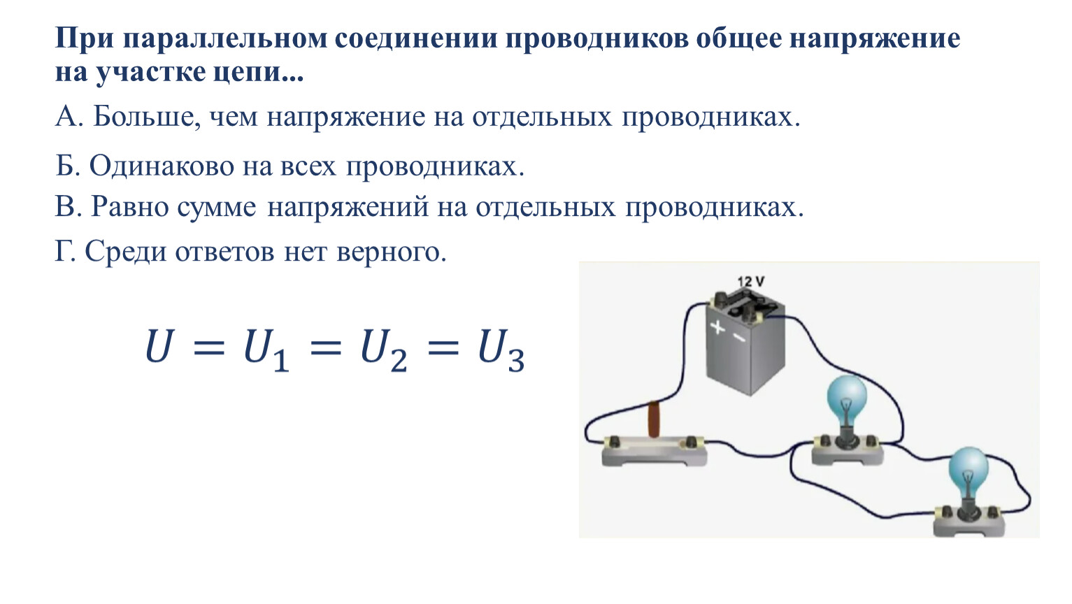 При параллельном соединении проводников общее напряжение на участке цепи...