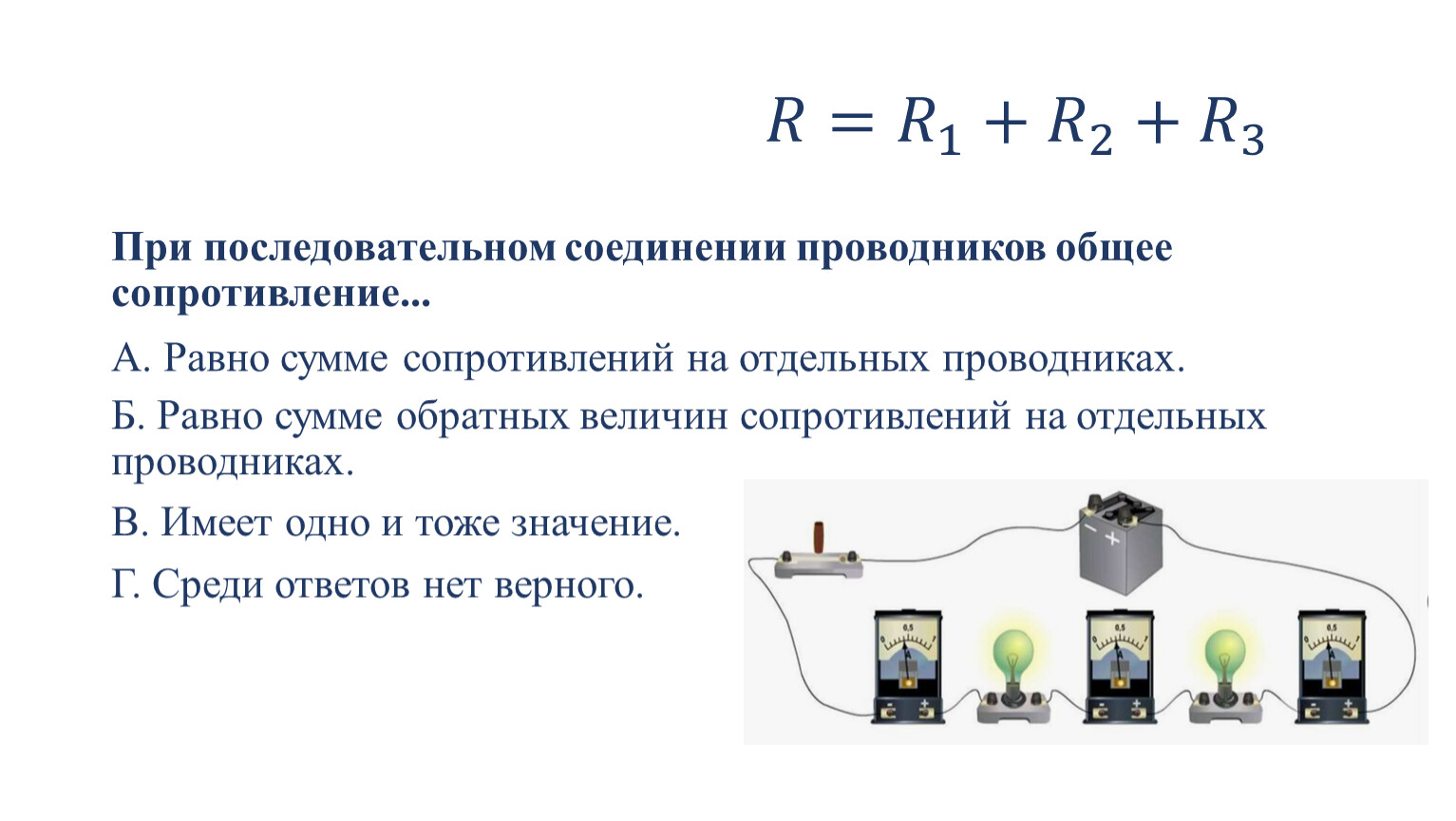 Б. Равно сумме сопротивлений на отдельных проводниках.